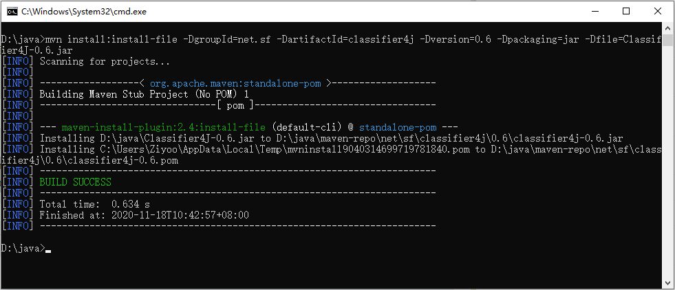 再比如安装 Classifier4J-0.6.jar,打开 cmd 窗口,切换到 jar 包所在目录,输入 mvn 命令,命令格式如下: